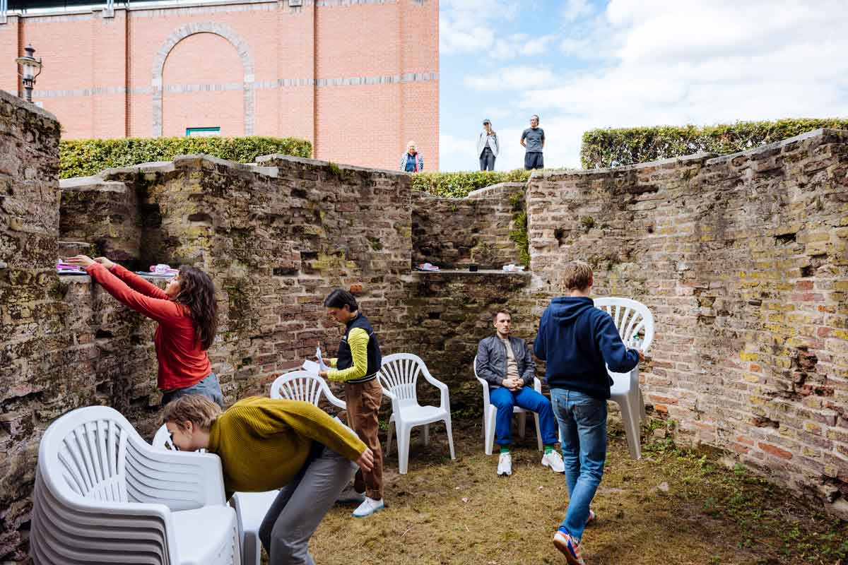 Für „Practising Apocalypse“ beschäftigte sich Marlin de Haan mit dem Belegungsversuch im Dortmunder Sonnenbunker im Juni 1964: 144 Freiwillige probten, begleitet von Ärzt:innen, Betreuer:innen und Journalist:innen, sechs Tage lang im ABC-sicher aufgerüsteten Weltkriegsbunker die Versorgung sowie die physiologischen und sozialen Reaktionen im Fall eines Atomwaffenangriffs. Der von der Presse begleitete Aufenthalt glich einem gemeinsamen Abenteuer, der Auszug einem Volksfest, welches auf eine Demonstration von Atomkraft-Gegner:innen bzw. Friedensaktionist:innen traf. Das Experiment blieb einmalig, löste aber eine große Neugier über die Verhaltensweisen der Proband*innen aus und befeuerte damals die mediale Debatte über die Schutzmaßnahmen im Falle eines Atomkriegs. Presseberichte, Zeitzeug:innen-Interviews und die medizinische und psychologische Auswertung des Belegungsversuchs legen Szenarien der Selbst- und Fremdinszenierung, des Feierns und Ausgeliefertseins, von Langeweile und Banalität offen, die in Text und Bewegung von fünf Performer:innen als Chor umgesetzt werden. Im Rahmen der Ausstellung „Zwischen Erfinden und Erfassen“ (Urbane Künste Ruhr 2025) bespielte dieser Chor zwischen architektonischen Prestige-Objekten, gescheiterten Bauvorhaben, Ausgrabungsstätten, Wohnhäusern, Kirchen und Kulturinstitutionen sowie in Interaktion mit Passant:innen den öffentlichen Raum im Duisburger Innenhafen.
